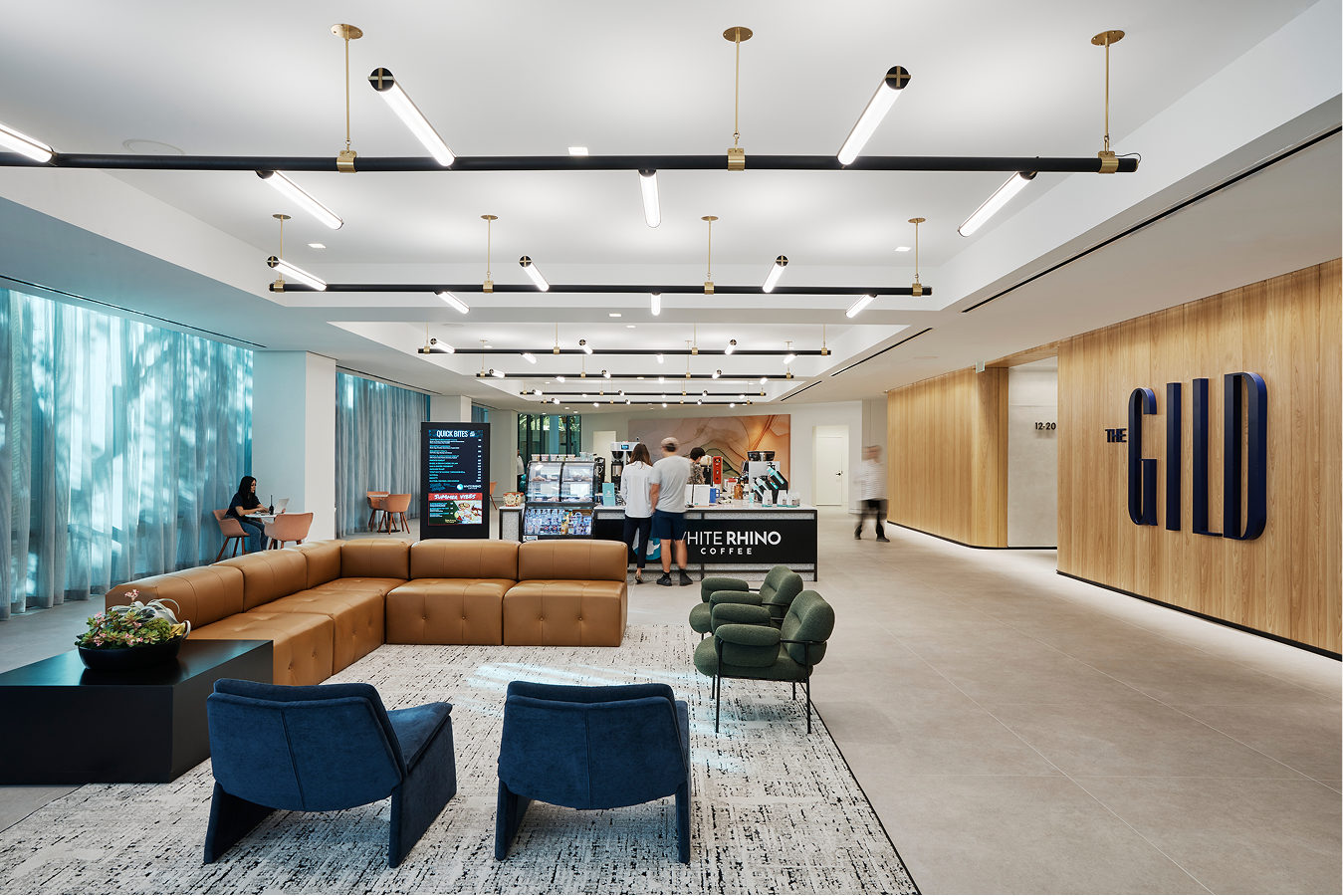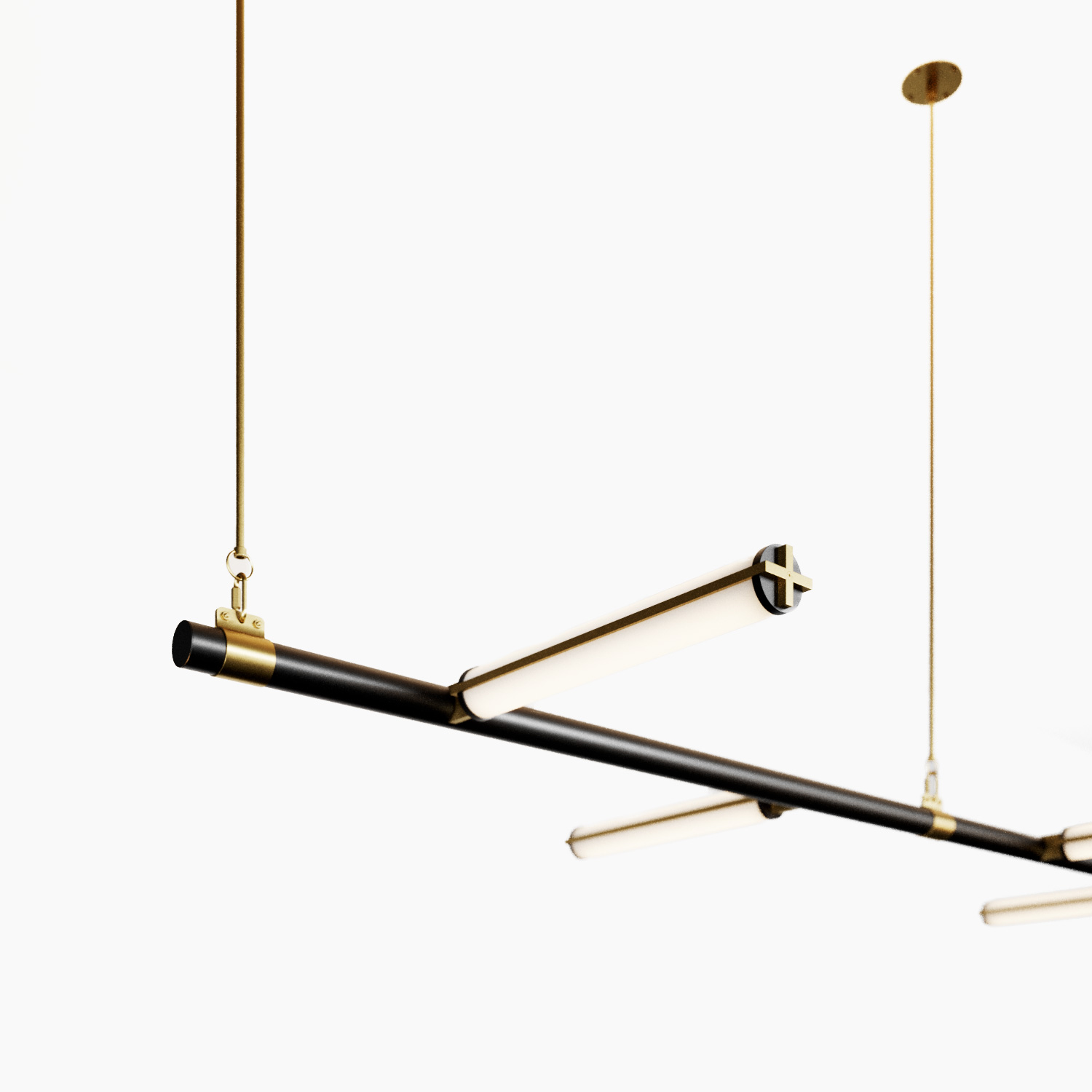A Bauhaus-inspired lighting system designed for large-scale installations, composed of wall-to-wall spans, linear suspensions, and wall sconces.